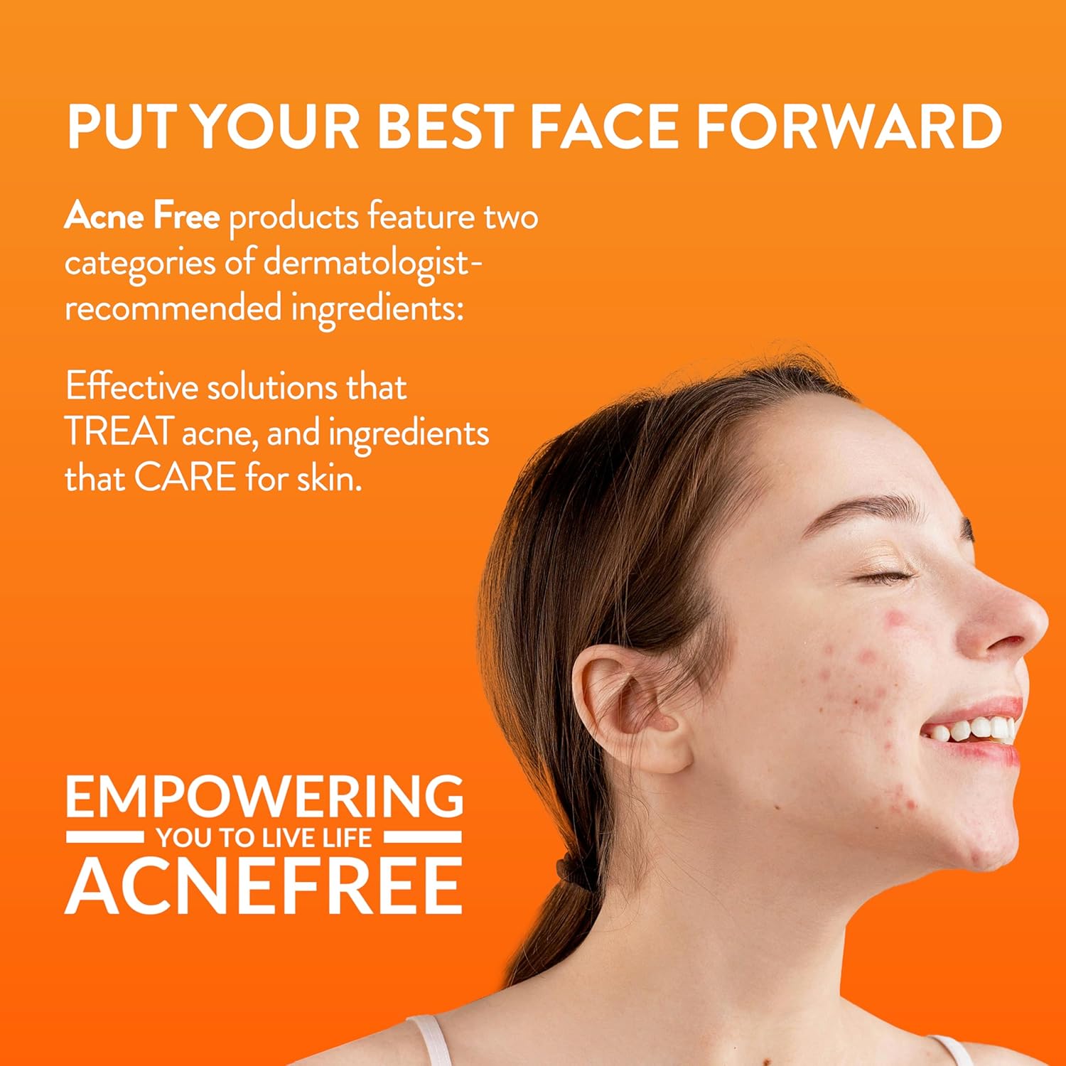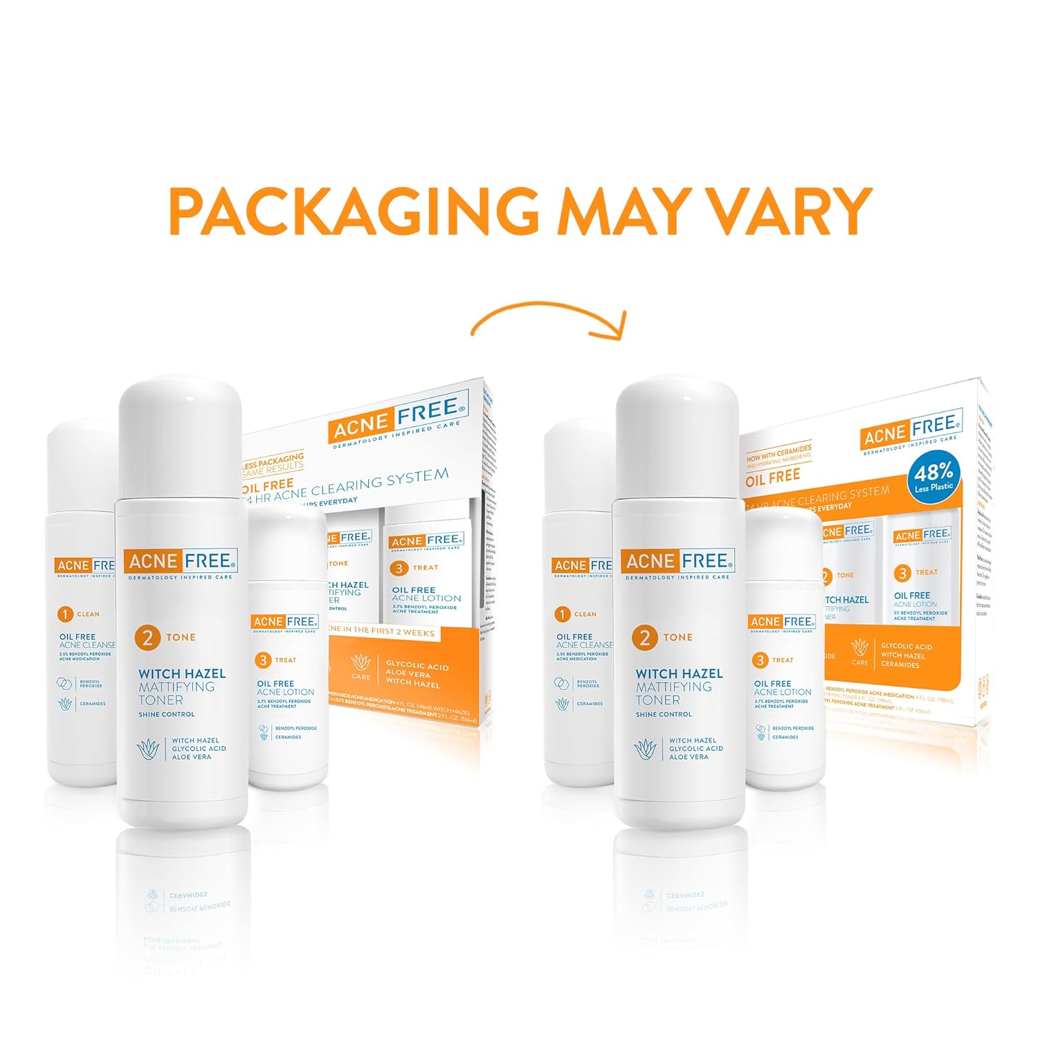 If you experience hormonal acne, blackheads, scars, oily skin or that annoying whitehead – AcneFree is for you! AcneFree combats facial and body acne for men and women prone to acne, breakouts, and oily skin. It combines acne-fighting actives with caring ingredients to rapidly treat breakouts while balancing your skin for a clean, fresh-faced look. Our best-selling acne kit is the 3-Step 24H Acne Clearing System. Cleanse your face with our Oil-Free Acne Cleanser, balance skin’s pH with our Witch Hazel Mattifying Toner, and treat skin with our Oil Free Acne Lotion. Using dermatologist recommended Micronized Benzoyl Peroxide with natural ingredients, like witch hazel and aloe vera, gives results that can be seen as rapidly as 3 days! AcneFree is the only brand offering three different acne clearing systems for moderate acne, severe acne, and acne-prone sensitive skin. It’s as easy to use as any other acne mask or serum, face wipes or soaps. It’s simpler to use than many popular Korean and Japanese acne therapies, which often suggest a 10 step ritual. How To Use AcneFree: Step 1: Oil-Free Acne Cleanser Apply a dime-size amount to damp skin and gently massage, avoiding the eye area. The cleanser can also be used on your chest or back. Rinse well. If peeling occurs, reduce usage. Step 2: Witch Hazel Mattifying Toner After cleansing, apply to entire face (or chest, or back) with a cotton pad, avoiding the eye area. Do not rinse. Step 3: Oil Free Acne Lotion Apply to entire face (or chest, or back) with or without a cotton pad, avoiding the eye area. Do not rinse. AcneFree Product Details: Dimensions: 6.6 x 1.8 x 7.3 inches Weight: 1 pound Supply: 60 Days Acne Treatment Type: Original For: Mild to Moderate Acne.
